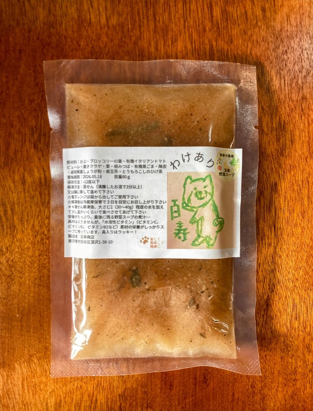 人気のご支持を頂いております、季節の薬膳野菜スープ! 最後に残る野菜なしの煮汁… 本当に具材は入りませんが、「水溶性ビタミン」(ビタミンC、ビタミンB1、ビタミンB2など)素材の栄養がしっかりスープに残っています 人間用の水分補給、料理に使ったりしていました 素材の良いところがよく出ています 良かったら愛犬さんの水分補給やごはん作りの素材に、送料無料の金額合わせに使ってください 残らないこともありますので、在庫不定期です 現在同じ種類で入る場合がございます おひとり様3点まで 使用食材は都度変わります。(写真はサンプルです) 容量:100g(少し多め容量が届く場合がございます、これはラッキー、おめでとうございます) 基本野菜は入りませんが、稀に入ります(お野菜が溶けています、特に芋類・かぼちゃ・葉物・きのこ類・海藻類・薬膳食材など) 粉で使っている素材は入る場合があります(モリンガ・ヘンプパウダー・きのこ類・黒豆きな粉など) 品質シールは季節の薬膳野菜スープ小を使用しております 残ったら冷蔵庫で保管しお早めにお召し上がり下さい 再冷凍保存可能 写真のお野菜は季節・気候毎に都度変更になります 商品リニューアルに関して 新しい『わけあり季節の薬膳 百寿野菜スープ』は 従来より水分量を最小限にして栄養を閉じ込めてお作りしております。 (アク抜き等の食材によって必要な処理はしております) 湯せん後、お皿に移してから*大さじ1(15~20g)程度を目安に水を加えてお使い下さい。 少し温かいくらいの温度で食べさせてあげて下さい。 新しい『わけあり季節の薬膳 百寿野菜スープ』どうぞお楽しみください!