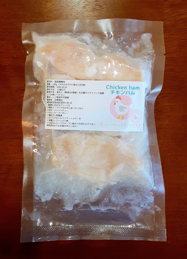 【体力の維持と消化器サポートに】 **安心・安全を追求した国産銘柄鶏肉を、低温調理でじっくり仕上げました。** 手作りごはんの素材としてもアレンジ自在。全ての犬におすすめしたい自慢のチキンハムです。 このチキンハムが特別な理由 1. 安心・安全へのこだわり:厳選した国産鶏肉を使用 手に入りやすい食材だからこそ、品質に徹底的にこだわりました。 ・選りすぐりの国産鶏肉:** ブロイラー鶏などでアレルギーが出る子への配慮も念頭に、アレルギーのリスクが低い、**安心・安全な国産鶏肉**を厳選しています。 ・低温調理で旨味凝縮:** 時間をかけて低温調理で作ることで、鶏肉本来の旨味を閉じ込め、**柔らかくジューシー**に仕上げています。 2. 薬膳の視点:消化器をサポート(帰経:脾・胃) 薬膳において、鶏肉は消化吸収をつかさどる**「脾」と「胃」に帰経**し、気(エネルギー)を補う食材とされています。 消化器のサポート:胃腸の働きを優しくサポートし、効率的な栄養吸収を助けます。 手作りごはんの素材として:** 薬膳野菜スープと合わせれば、簡単に「バランスの取れた1食」が完成します。 3. 無限に広がるアレンジレシピ そのままおやつとしてだけでなく、日々の食事のマンネリ解消に大活躍! | アレンジ | おすすめの用途 | | **+ポタージュ** | **シチュー**に(体調不良時やシニア犬に、百寿商店オリジナルカレー風ハーブスパイスと合わせて) | | **+鶏ガラ** | **参鶏湯(サムゲタン)**風に(滋養強壮に) | | **+オリーブオイルでソテー** | **チキンステーキ**に(特別感のあるご褒美に) | | **+栄養スープ** | **ミルク煮**に(栄養吸収を助ける) | | **+かぼちゃスープ少量でオーブン焼き** | **かぼちゃグラタン**風に | 保存方法と給与目安 * **開封後:** 残ったらスープと一緒に冷蔵庫で保管すると固くなりにくく、お早めにお召し上がり下さい。 * **冷凍保存:** 冷凍も可能ですが、冷凍焼け等で風味が損なわれる可能性があるため、お早めにお召し上がりください。 * **調理方法:** **湯せん(熱湯3分程度)**またはお湯に浸けてゆっくり解凍すると、出来たての旨味が戻ります。 * **愛犬と飼い主様:** もちろん、飼い主様が召し上がれますので、ご一緒にどうぞ! | **帰経** | 脾・胃 | | **容量** | 100g (14kg前後の子の1食分:1日2食の目安) | **【タンパク質給与量 目安(1日2食の1食分)】** 標準の運動量の子:2kg→約15g、4kg→約30g、7kg→約55g、10kg→約70g、12kg→90g、14kg→105g、16kg→120g、18kg→135g、20kg→150g、22kg→165g、24kg→180g、26kg→195g、28kg→210g、30kg→225g、35kg→262g、40kg→300g