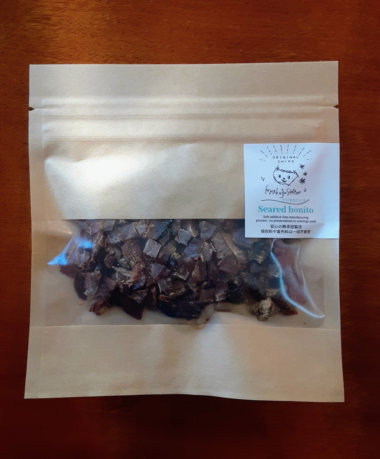 This is a premium, additive-free treat packed with oceanic goodness. We take domestically sourced bonito, briefly sear the surface using the traditional Tataki method (famous for straw or charcoal grilling) to enhance the aroma, and then concentrate its rich flavor into thin, oven-baked flakes.