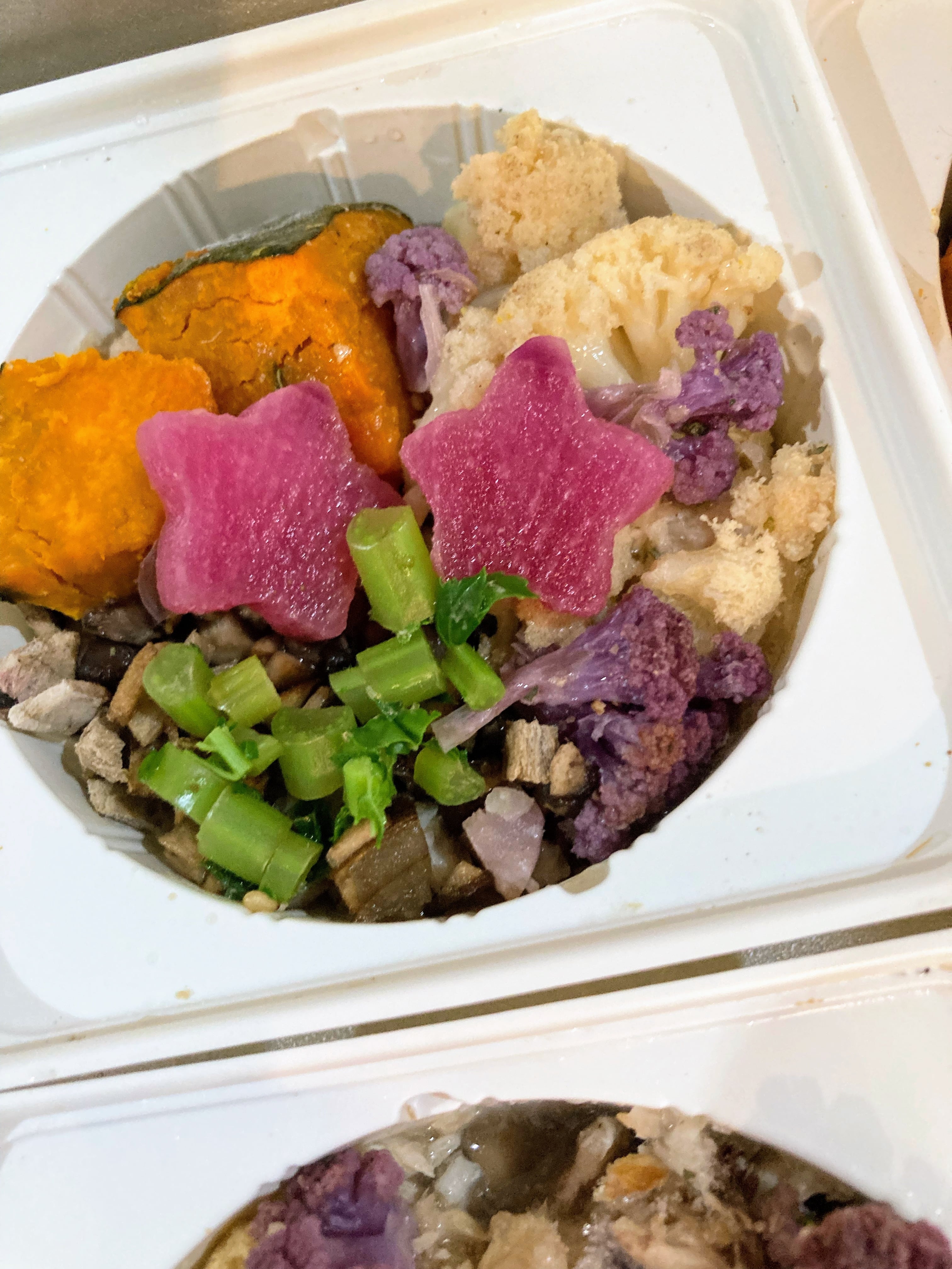 使用食材:国産天然ぶりとかんぱち・国産かぼちゃ・カリフらワー・紫カリフラワー・紅くるり大根・ごぼう・椎茸・大根の葉・鯛出汁スープ(陳皮・有機クコの実)・有機モリンガ粉・百寿商店オリジナルカレー風ハーブスパイス