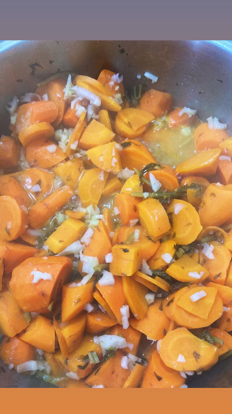少量の水と自家製乳清(ホエー)少量の有機カメリナオイルで炒め、少量のはちみつで仕上げています(自家製乳清を作る際に有機レモン汁を使用しています)